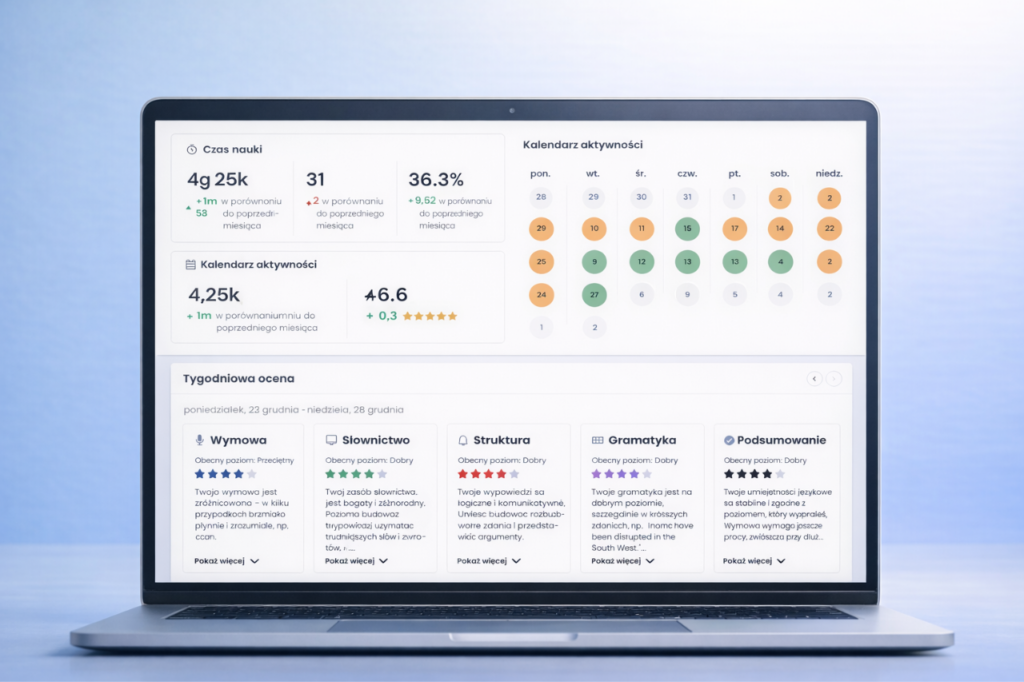 Bieżącym elementem każdej rozmowy z lektorem AI jest natychmiastowa korekta błędów oraz propozycja prawidłowej wypowiedzi. Użytkownik otrzymuje również w aplikacji tygodniowe podsumowanie swoich postępów. Z perspektywy HR, narzędzie oferuje pełną mierzalność efektów – raporty pozwalają szczegółowo monitorować aktywność i postępy zespołu.